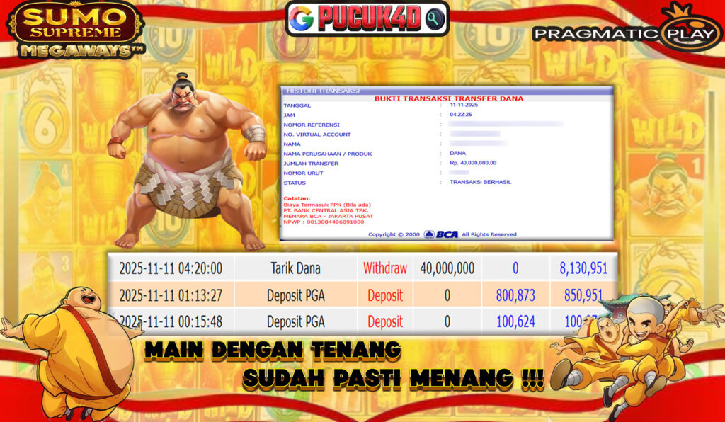telah berhasil mendapatkan kemenangan besar di ( Sumo Supreme Megaways  Pragmatic Play) dengan kemenangan Sebesar Rp 40 JT Setelah mengisi formulir withdraw dengan kurung waktu hanya 5 – 10 menit. Pihak PUCUK4D sudah melakukan transfer kepada pemilik Userid dan dana sudah dapat di cairkan oleh pemenang. Bukti pembayaran yang kami berikan merupakan bukti pembayaran yang SAH / VALID yang langung di dapatkan melaui tanda transfer transaksi dari Bank yang di tuju