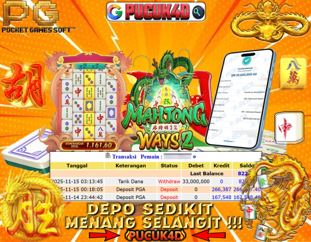 telah berhasil mendapatkan kemenangan besar di ( Mahjong Ways 2 PGSoft ) dengan kemenangan Sebesar Rp 33 JT Setelah mengisi formulir withdraw dengan kurung waktu hanya 5 – 10 menit. Pihak PUCUK4D sudah melakukan transfer kepada pemilik Userid dan dana sudah dapat di cairkan oleh pemenang. Bukti pembayaran yang kami berikan merupakan bukti pembayaran yang SAH / VALID yang langung di dapatkan melaui tanda transfer transaksi dari Bank yang di tuju