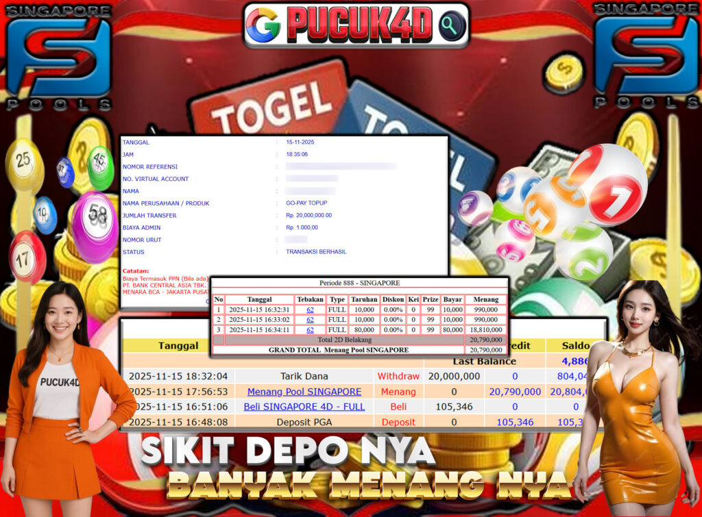 telah berhasil mendapatkan kemenangan besar di ( TOGEL SINGAPORE POOLS ) dengan kemenangan Sebesar Rp 20 JT Setelah mengisi formulir withdraw dengan kurung waktu hanya 5 – 10 menit. Pihak PUCUK4D sudah melakukan transfer kepada pemilik Userid dan dana sudah dapat di cairkan oleh pemenang. Bukti pembayaran yang kami berikan merupakan bukti pembayaran yang SAH / VALID yang langung di dapatkan melaui tanda transfer transaksi dari Bank yang di tuju